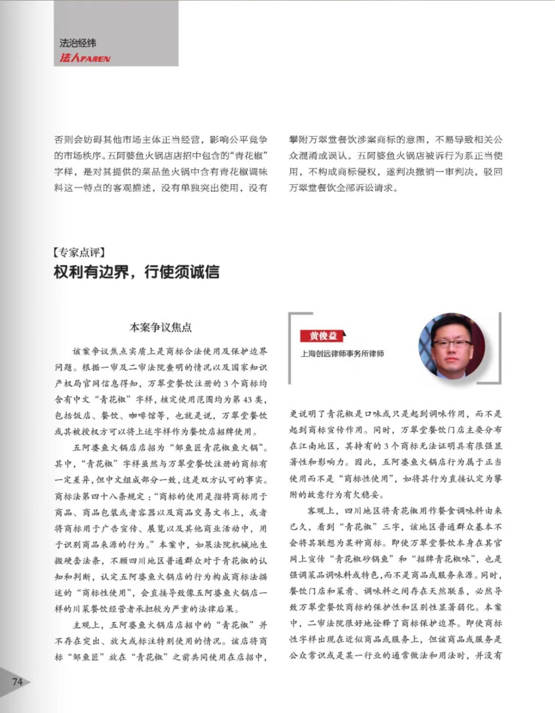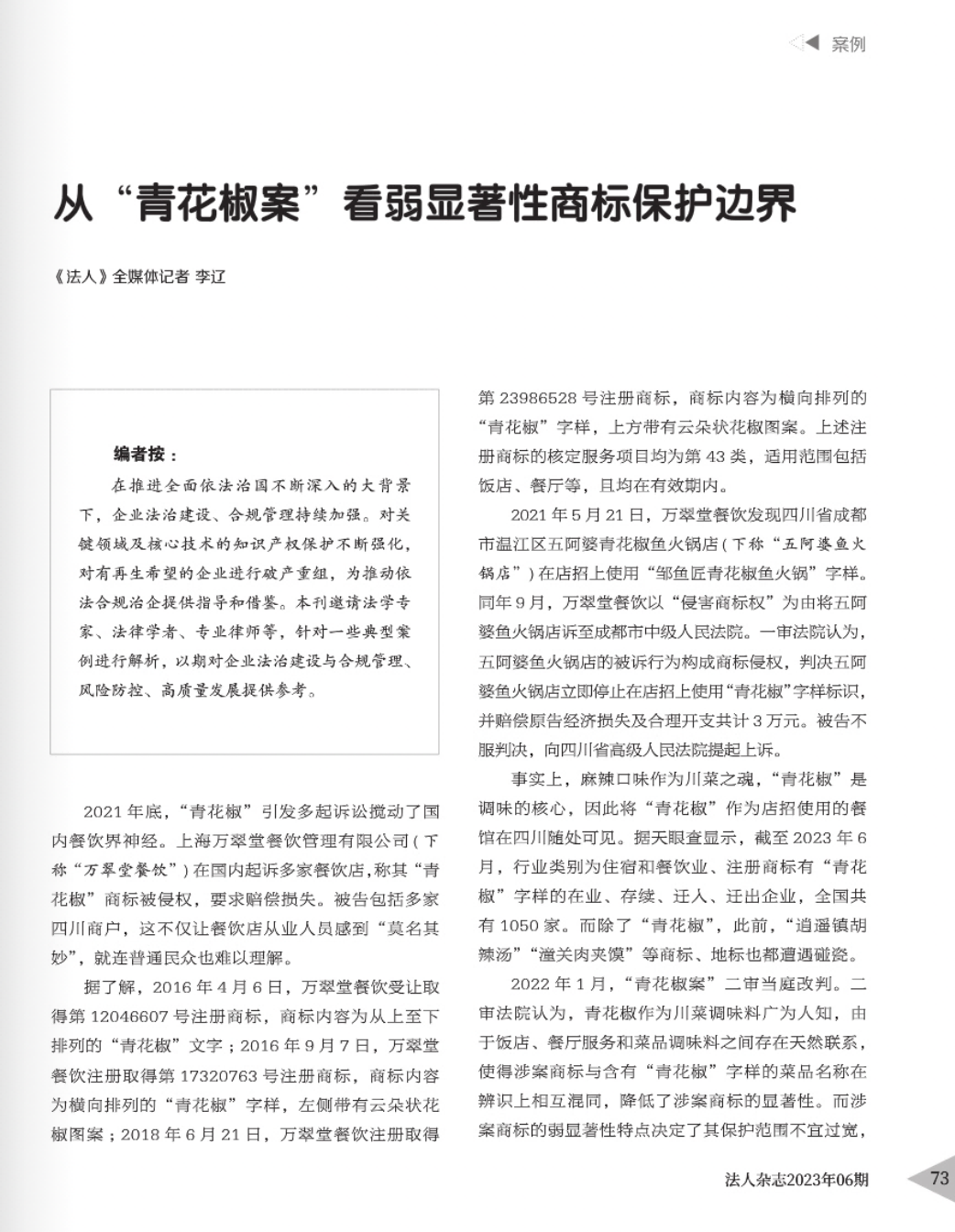 深圳辉知简讯 | 辉知队黄俊益律师应“法治日报”旗下杂志邀请,就“青花椒”案发表专家点评